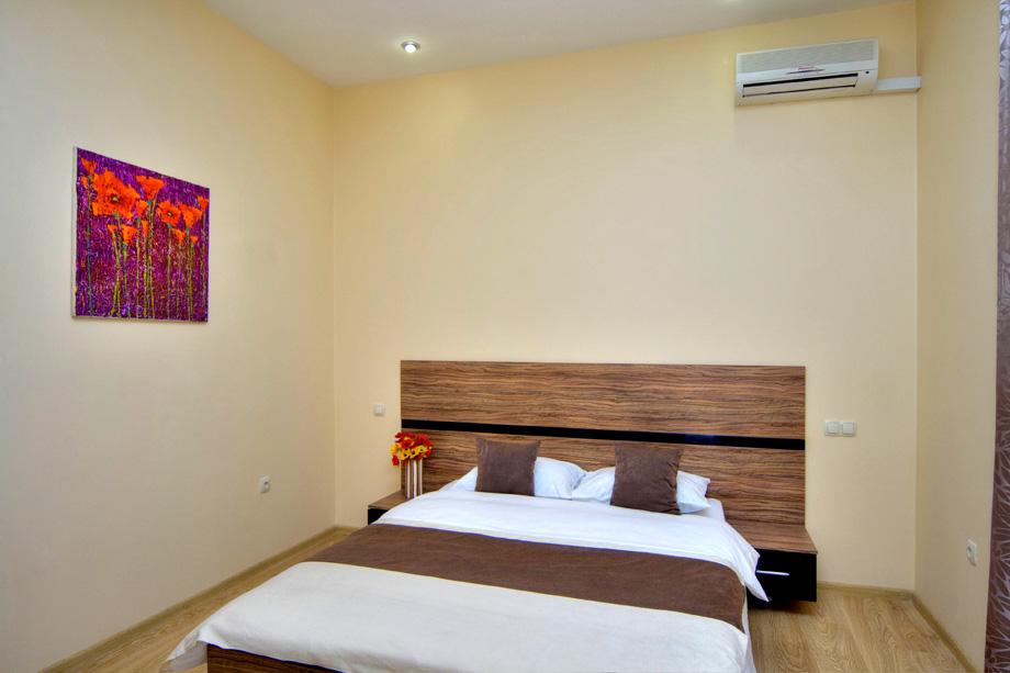 В спальной комнате двуспальная кровать, шкаф, телевизор, спутниковое ТВ, кондиционер.